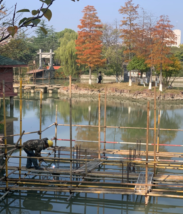 一夜氣溫驟降,從暖秋進(jìn)入寒冬,寒風(fēng)勁吹,但在世紀(jì)公園內(nèi),呈現(xiàn)在人們面前的卻是一派熱火朝天的施工景象,機(jī)器隆隆,電光閃爍,施工人員頂著寒風(fēng),爭分奪秒,奮戰(zhàn)在施工一線,有的在搭建腳手架、有的在焊割鋼材、有的在搬運(yùn)材料……