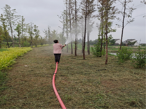 在晴熱少雨的日子,夏季植物生長茂盛,各類雜草長勢迅猛,清除雜草也是當下綠地養(yǎng)護的一大任務(wù)。在天氣熱、任務(wù)重、困難多的情況下,綠化養(yǎng)護隊伍根據(jù)植物需求,堅持科學(xué)管理、序時作業(yè)、精心維護,有的在澆水除草,有的在松土施肥,有的在修枝剪葉……廊道兩岸一派忙碌的勞動景象。在隊員們的精心呵護下,蟒蛇河水上文化生態(tài)廊道呈現(xiàn)一片欣欣向榮的綠色生機。